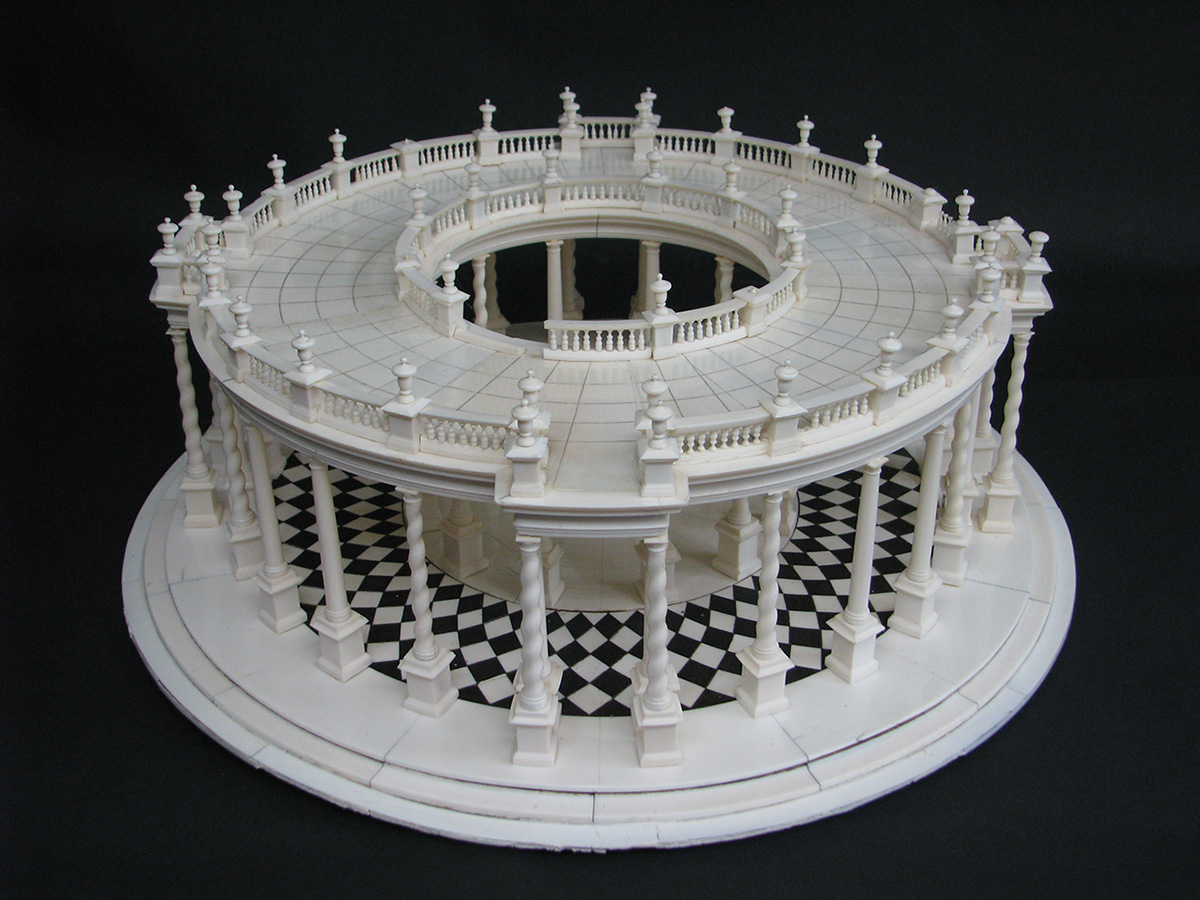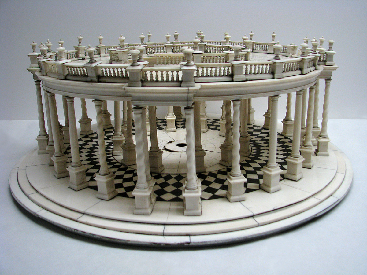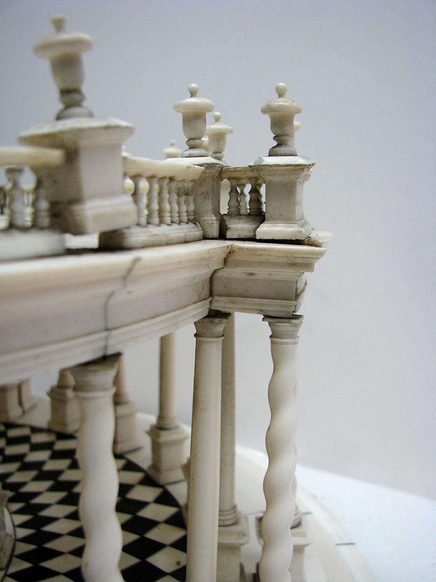 Das außergewöhnliche aus 636 gedrechselten Einzelelementen zusammengesetzte Modell eines Säulentempels befand sich in einem extrem instabilen Zustand. Zahlreiche Klebungen zwischen den einzelnen Elfenbeinteilen hatten sich gelöst, die dünnen Elfenbeinplatten der Deckplatte waren verwölbt und hatten sich aus der Konstruktion gelöst. Die stark verschmutzte Elfenbeinoberfläche sowie vergilbte klebstoffrückstände früherer Restaurierungsversuche beeinträchtigten das Erscheinungsbild