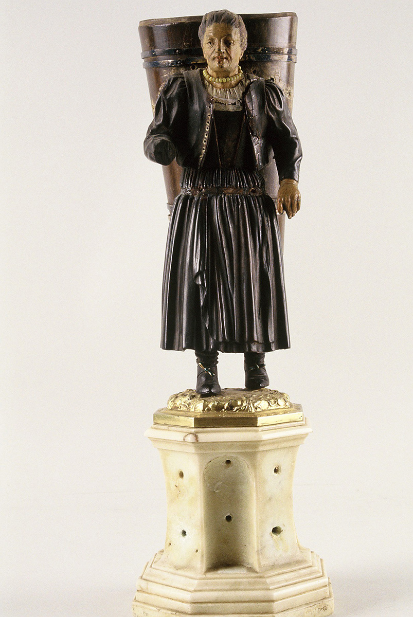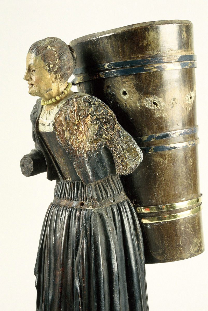 Die reich dekorierte Buttenträgerin befindet sich zum Zeitpunkt der Restaurierung in einem sehr desolaten Zustand. Nicht mehr haftende Klebstoffe und Retuschen einer Altrestaurierung müssen entfernt werden. Die silbernen Besätze und Fassungen der Edelsteine sind schwarz oxidiert. Die Abbildung zeigt die Figur im Zustand nach der Demontage aller Schmuckbesätze.