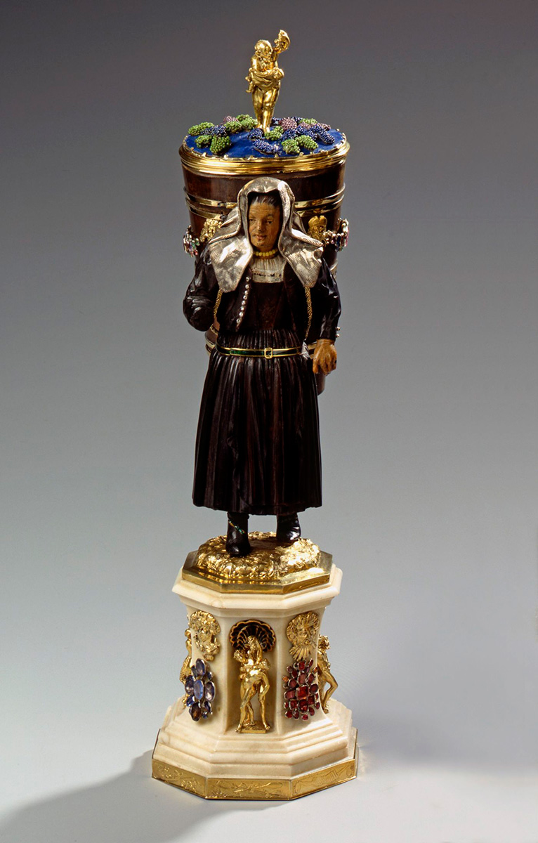 Ebenholz, Silber vergoldet, Email, Glasfluss, Diamanten, Rubine, Saphire,Topase, Opale, Chrysolithen