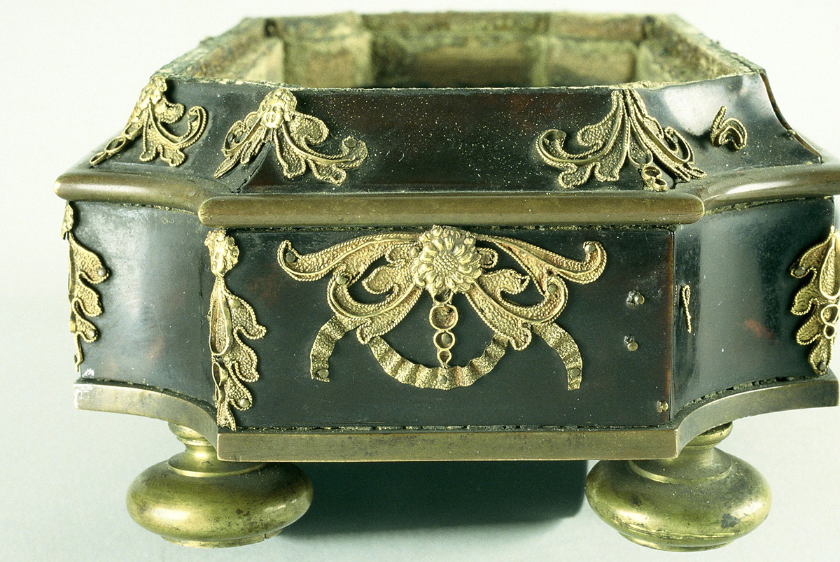 Der mit Schildpatt furnierte Holzkasten zeigt starke Verschmutzung, das Schildpatt erscheint stumpf und vergraut.