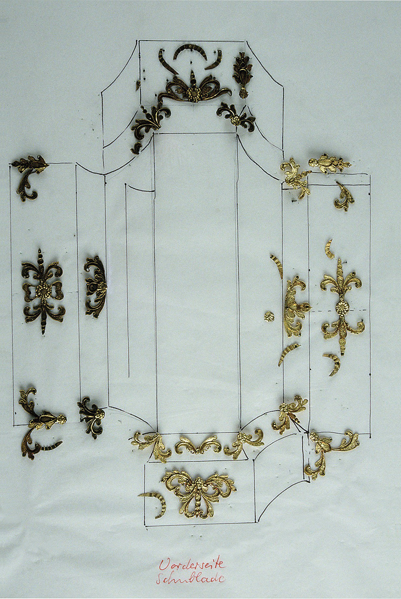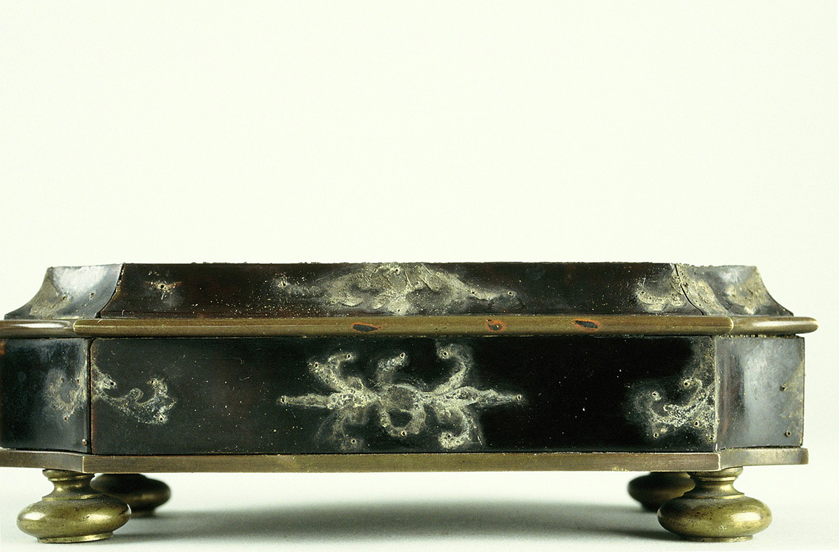 Zur Reinigung der Schildpattoberfläche und der Ornamente werden die Metallbesätze entfernt. Dicke Krusten aus Schmutz und früheren Reinigungsmaterialien haben sich unter den Besätzen abgelagert.