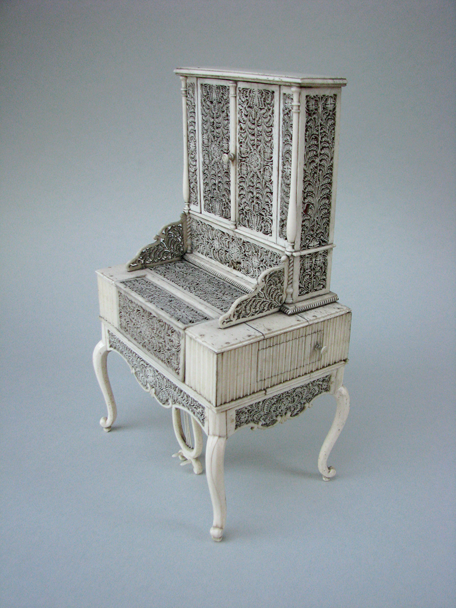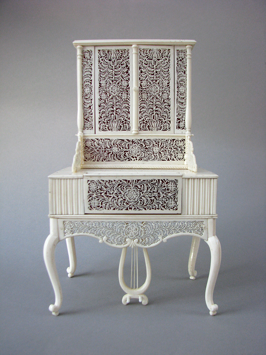 Das Piano wird zur Reinigung weitgehend in seine zahlreichen Einzelteile zerlegt, die Oberflächen und die filigran gesägte Durchbruchsarbeit gereinigt. Die Seidenbespannung wir vom Träger abgelöst, gereinigt und mit einem Trägermaterial hinterlegt. Die Reinigung des beschrifteten Notenblattes erfolgt trocken.