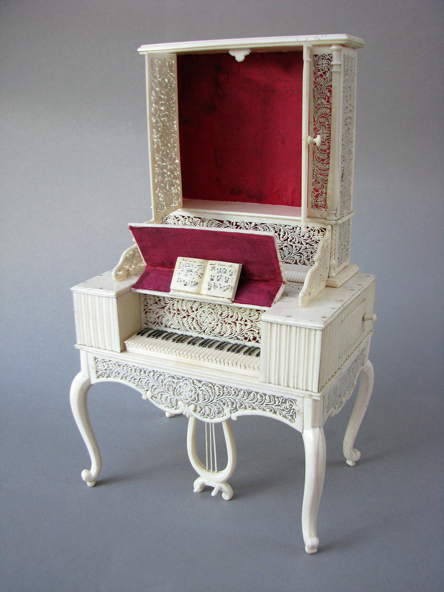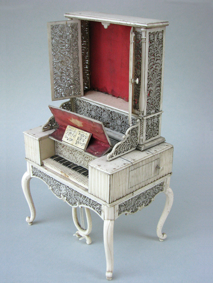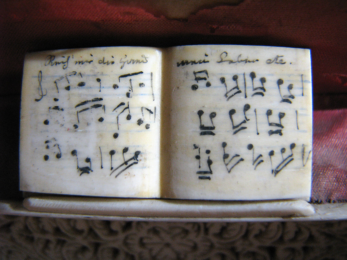 Nach der Reinigung und Neuverleimung zeigt sich der wunderschöne, fein gesägte florale Dekor wieder in seiner ganzen Schönheit. Die Liedzeile auf dem Notenblatt, „Reich mir die Hand mein Leben, e.t.c.“ ( der tatsächliche Text „Reich mir die Hand mein Leben, komm auf mein Schloß mit mir…“) erlaubt die Datierung mit dem terminus post quem 1787, dem Jahr der Uraufführung von Mozarts Oper Don Giovanni. Der beliebte Gassenhauser fand seinen Niederschlag in zahlreichen Kunstbereichen und wurde auch auf dem Miniaturpiano verewigt.
