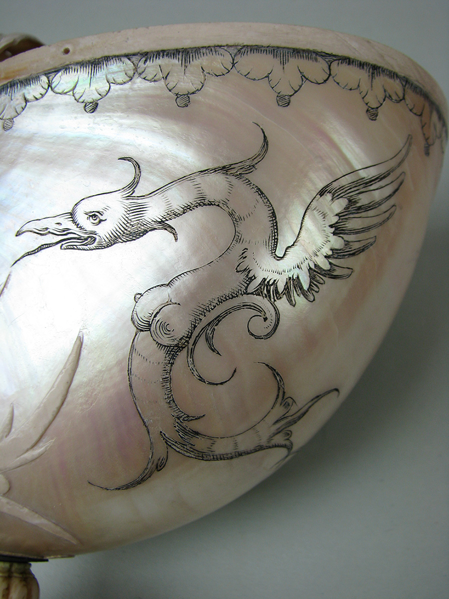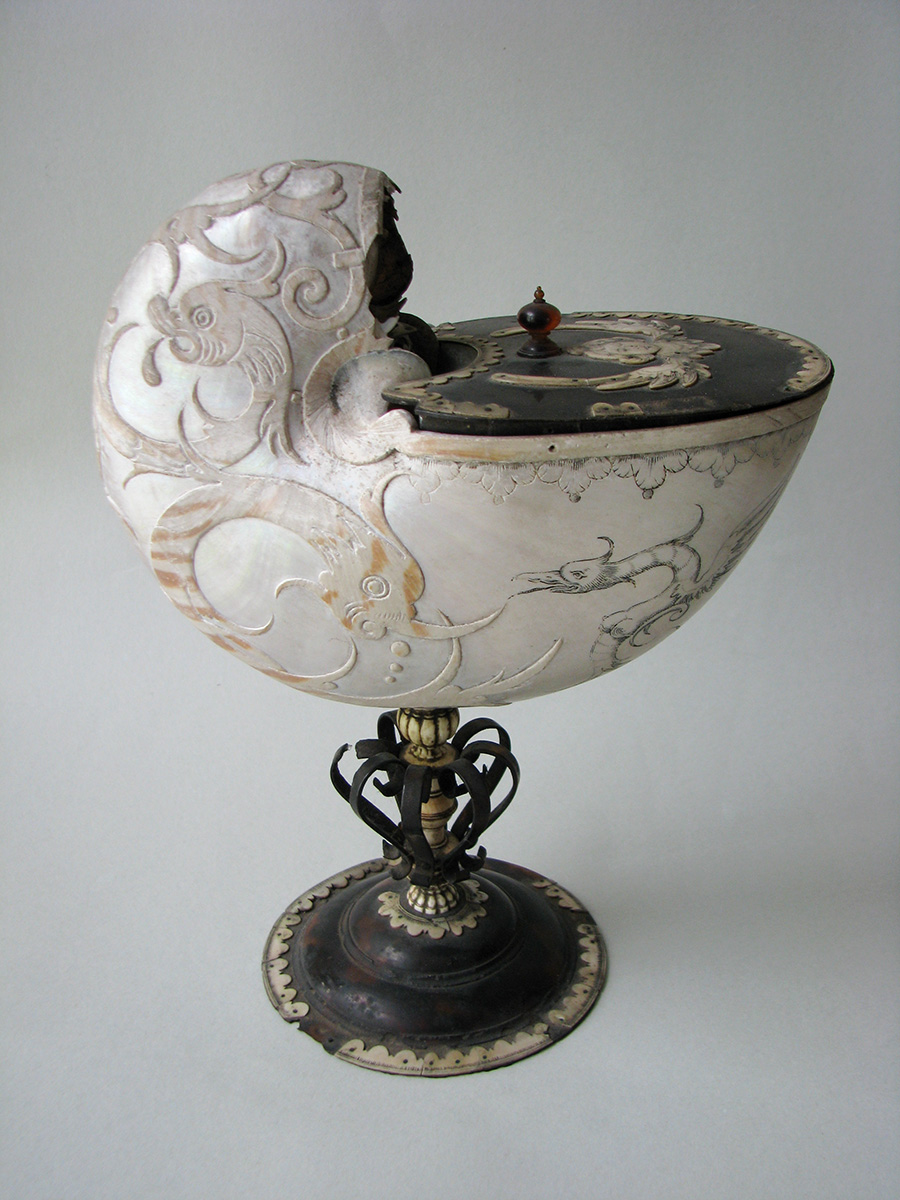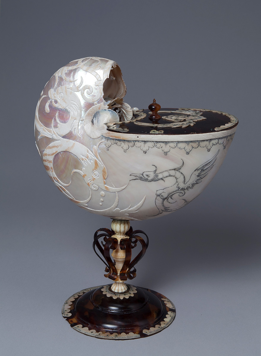 Der Nautilus, zur Gattung der Perlboote gehörend, wurde bereits in den frühen Wunderkammern als Naturalia unverziert in zahlreichen Sammlungen präsentiert. Später begann man die Gehäuseschalen zu gravieren, mit Ätzdekor und Schwarzgravur zu verzieren und in Gestalt verschiedener Gegenstände zu fassen. Üblicherweise geschah dies in Gold und Silber, häufig auch unter Verwendung weiterer Werkstoffe wie Email, Perlen und Steinbesatz. Die Fassung des Nautilus aus Dieppe mit ausschließlich organischen Materialien stellt daher eine Besonderheit dar.