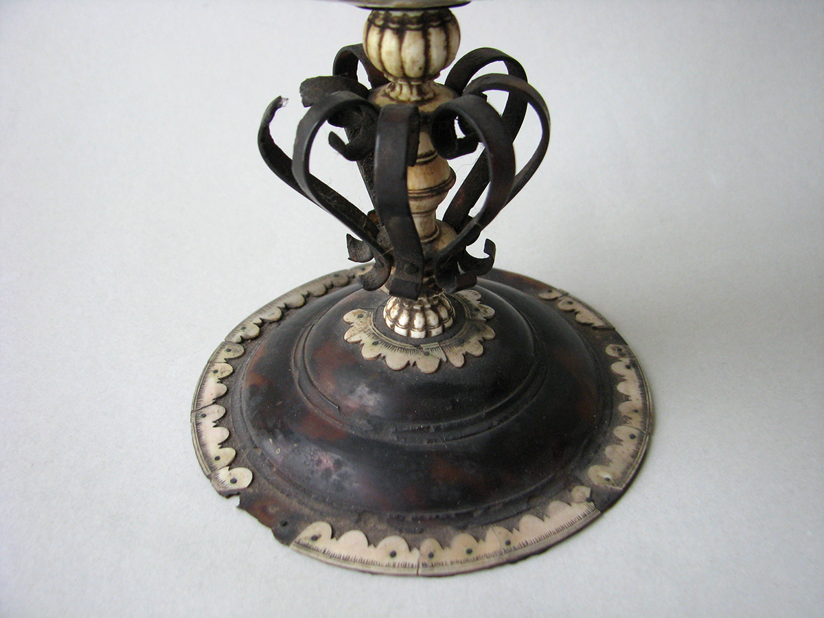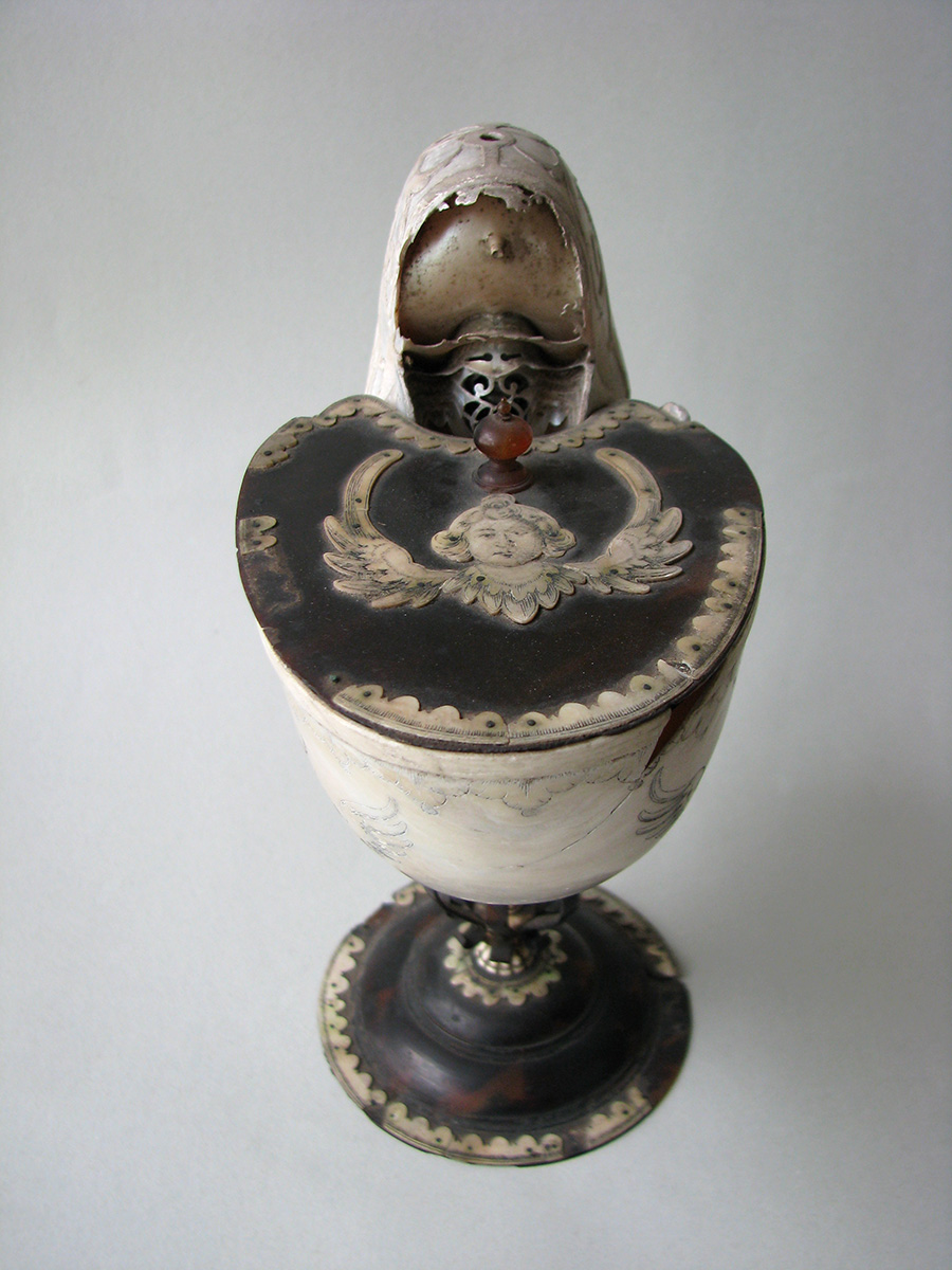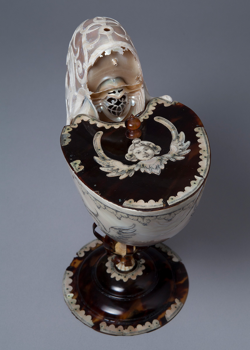 Der Nautilus, zur Gattung der Perlboote gehörend, wurde bereits in den frühen Wunderkammern als Naturalia unverziert in zahlreichen Sammlungen präsentiert. Später begann man die Gehäuseschalen zu gravieren, mit Ätzdekor und Schwarzgravur zu verzieren und in Gestalt verschiedener Gegenstände zu fassen. Üblicherweise geschah dies in Gold und Silber, häufig auch unter Verwendung weiterer Werkstoffe wie Email, Perlen und Steinbesatz. Die Fassung des Nautilus aus Dieppe mit ausschließlich organischen Materialien stellt daher eine Besonderheit dar.